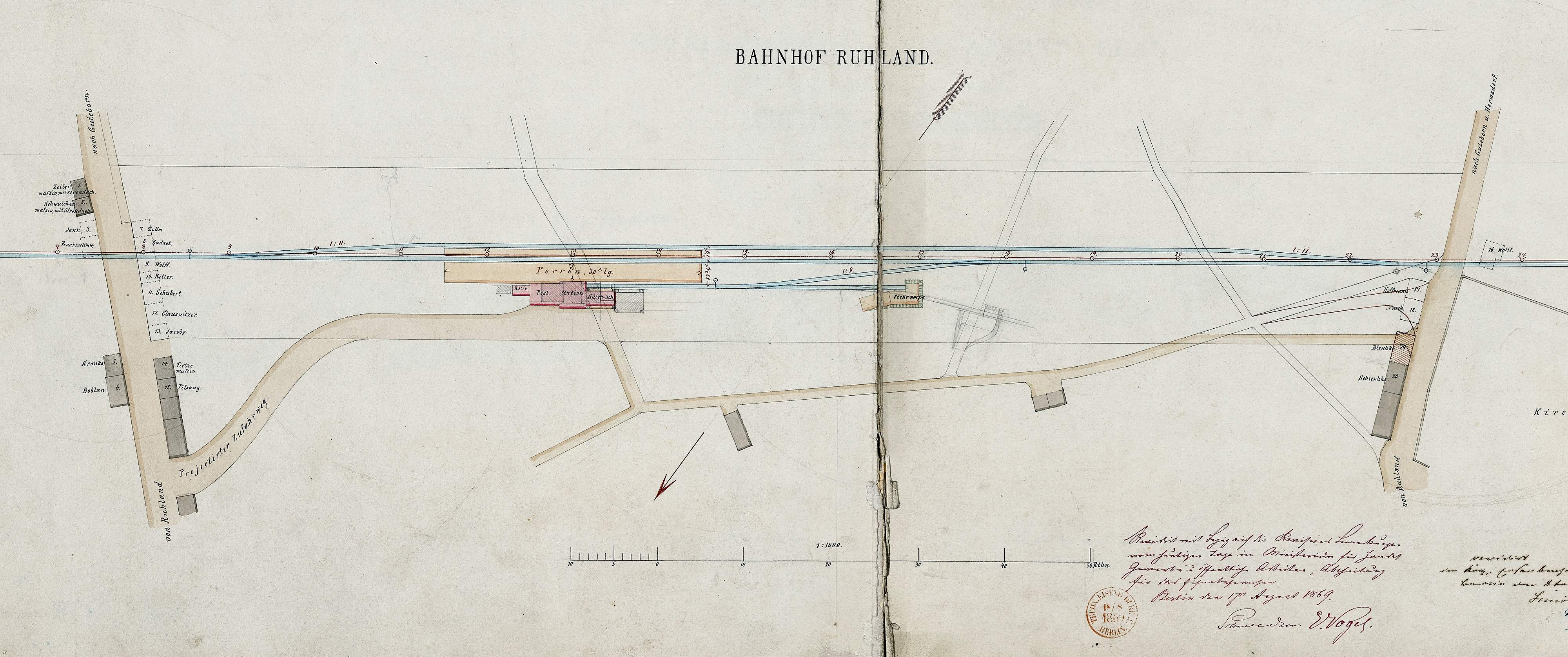 Der nachfolgende Plan zeigt den ältesten Entwurf für den Bahnhof Ruhland aus dem Jahr 1869. Auf diesem Entwurf befindet sich der Bahnhof noch an einer eingleisigen Strecke, die im Bahnhof durch ein lokales Nebengleis zu einer Ausweichstelle erweitert wurde. Daher verfügt dieser Bahnhof nur über einen Bahnsteig.