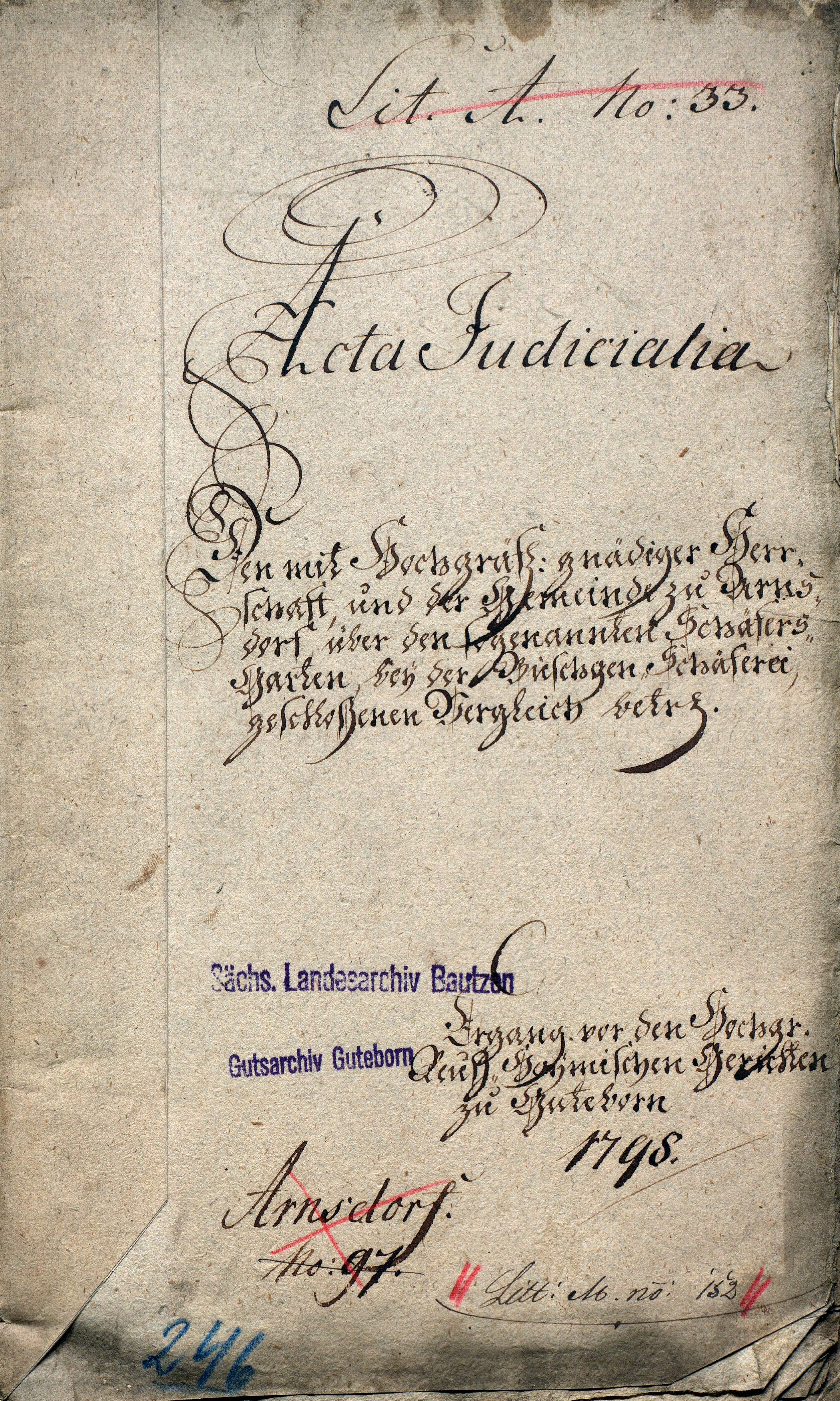 : Vergleich zwischen der Herrschaft und der Gemeinde Arnsdorf (bei Ruhland) über den Schäfergarten. (1798). [Handschrift] Sächsisches Staatsarchiv, 50140 Gutsherrschaft Guteborn, Nr. 246 (Lit. M Nr. 152) Archivverbund Bautzen, Schloßstraße 10, 02625 Bautzen 03.02.2026,